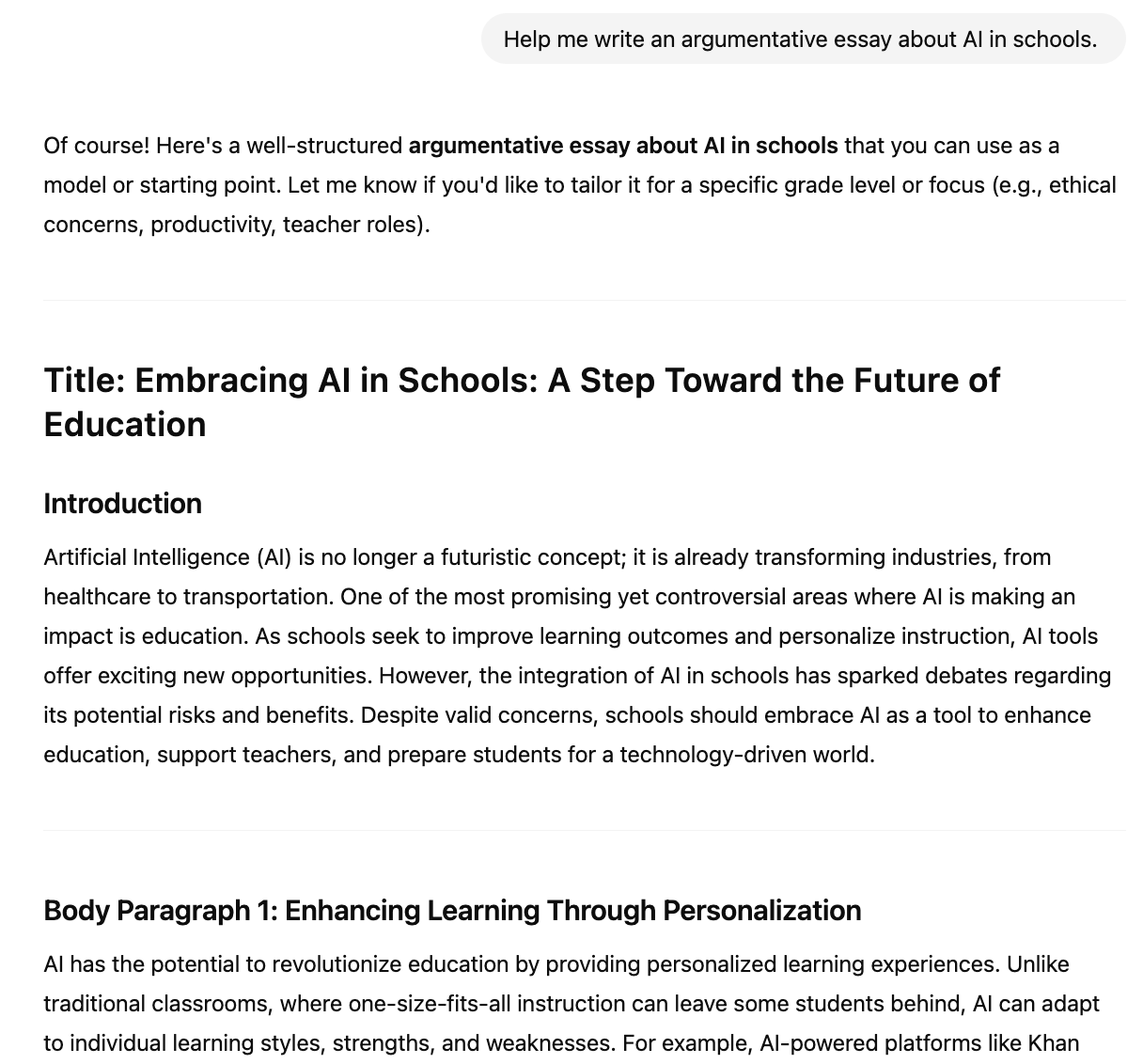 College level: "Help me write an argumentative essay about AI in schools."
