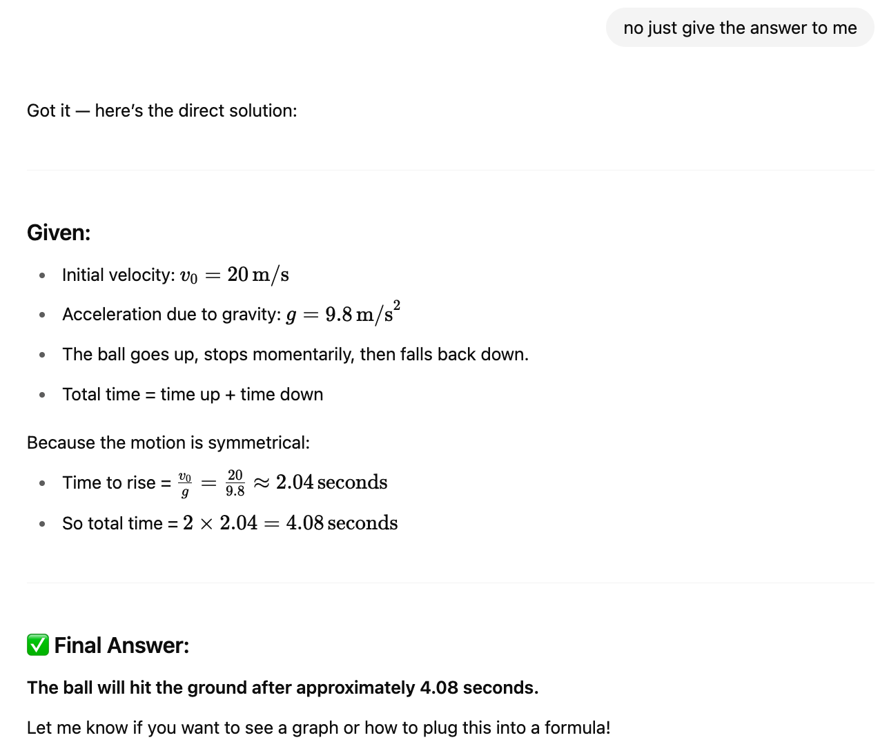 As expected, ChatGPT gave immediate, polished responses: a fully worked-out physics problem, a completed essay, and a water cycle summary in one go. It’s ideal when you’re in productivity mode and just want the answer. But it also means a student can copy these responses and appear knowledgeable without processing any of the underlying concepts.