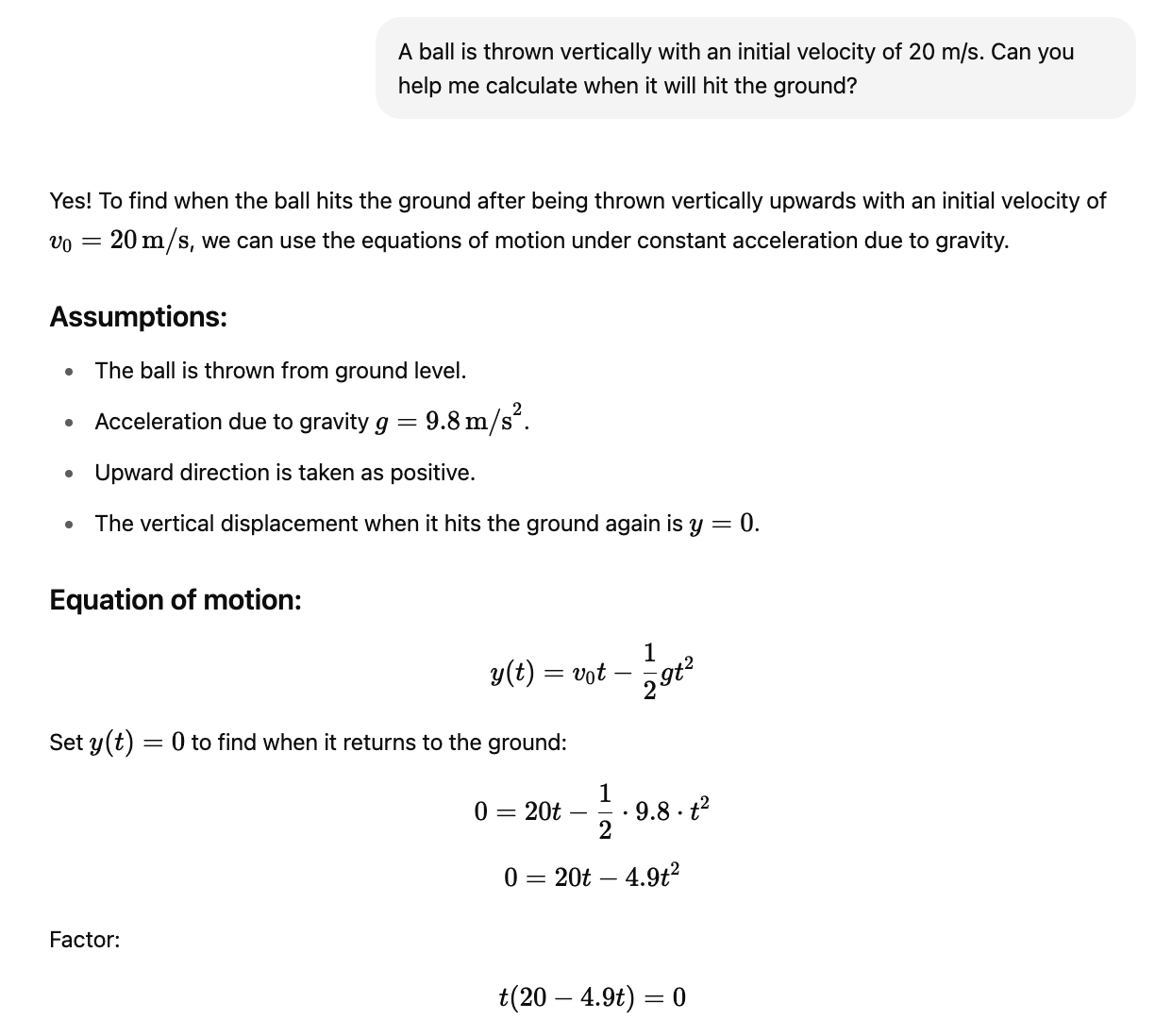 10th grade physics: "A ball is thrown vertically with an initial velocity of 20 m/s. Can you help me calculate when it will hit the ground?"